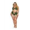 Он включает в себя бюстгальтер с треугольными чашечками с золотым кольцом в центре, регулируемыми бретелями и регулируемой застежкой на спине. Пояс с подвязками, также выполненный из эластичного кружева с металлическим шнурком, имеет регулируемые подвязки для идеальной посадки. В комплект входят подходящие кружевные стринги.