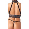 Топ имеет откровенный дизайн с бархатными бретелями и регулируемыми ремешками, а также застежку-крючок на спине для идеальной посадки. Кружевной воротник-холтер застегивается сзади на шее на две пуговицы. Стринги выделяются декоративной и возбуждающей цепочкой в открытой зоне, а также являются съемными для большей универсальности.