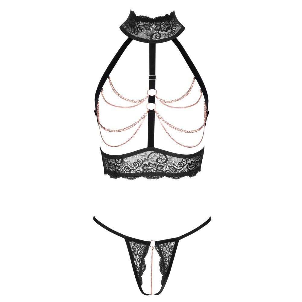 Соблазнительный комплект без промежности от Abierta Fina, состоящий из топа с открытыми чашками и стрингов в тон. Мягкое и эластичное черное кружево сочетается с бархатными бретелями и цепочками розово-золотого оттенка, создавая утонченный и провокационный образ.