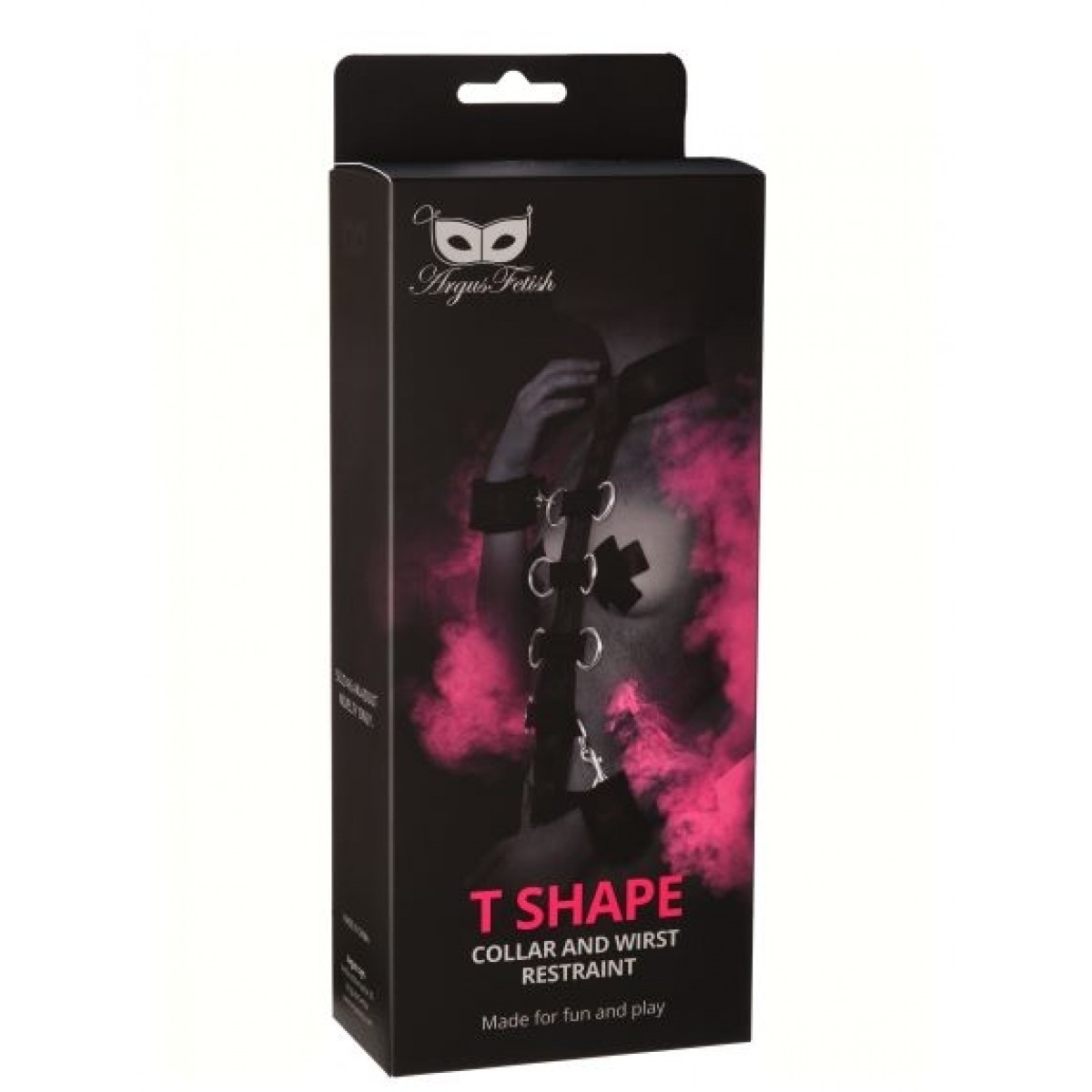 Т-образный ошейник с регулируемыми и съемными манжетами, соединенными прочными карабинами, идеально подходит для изучения контроля и подчинения с комфортом и универсальностью.