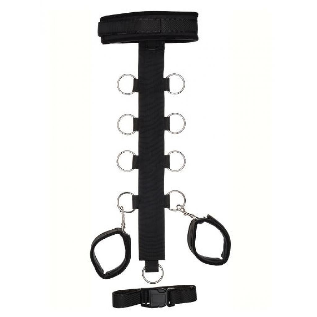 Т-образная конструкция соединена с двумя наручниками, также регулируемыми, с помощью прочных карабинов, обеспечивающих прочную и надежную фиксацию. Манжеты можно снимать или переставлять, обеспечивая универсальность использования.