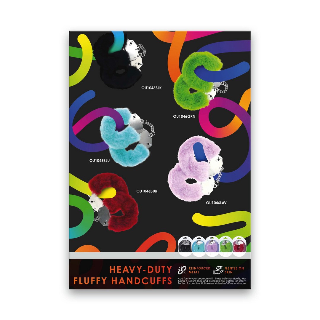 Тяжелые пушистые наручники продают shett (OU1046BLK - OU1046GRN - OU1046BLU - OU1046BUR - OU1046LAV) на английском языке.