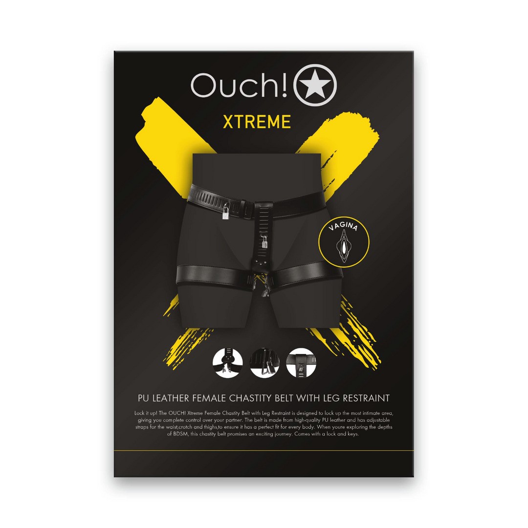 Женский пояс целомудрия из искусственной кожи с ограничителем для ног (OU1029BLK) на английском языке.